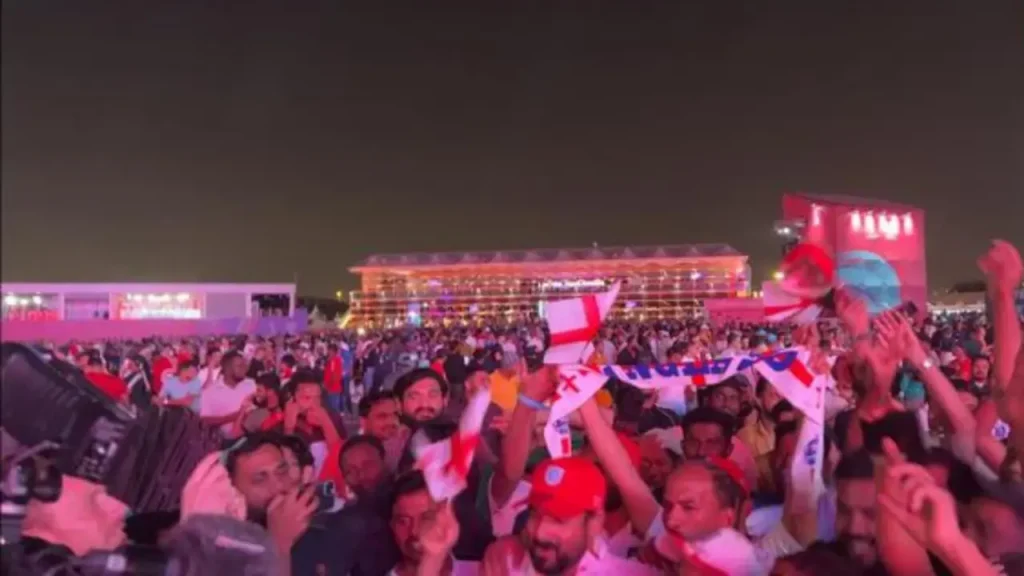 Suporter Timnas Inggris merayakan kemenangan timnya atas Iran dalam lanjutan Piala Dunia 2022 di FIFA Fan Zone, Senin (21/11/2022) WIB.